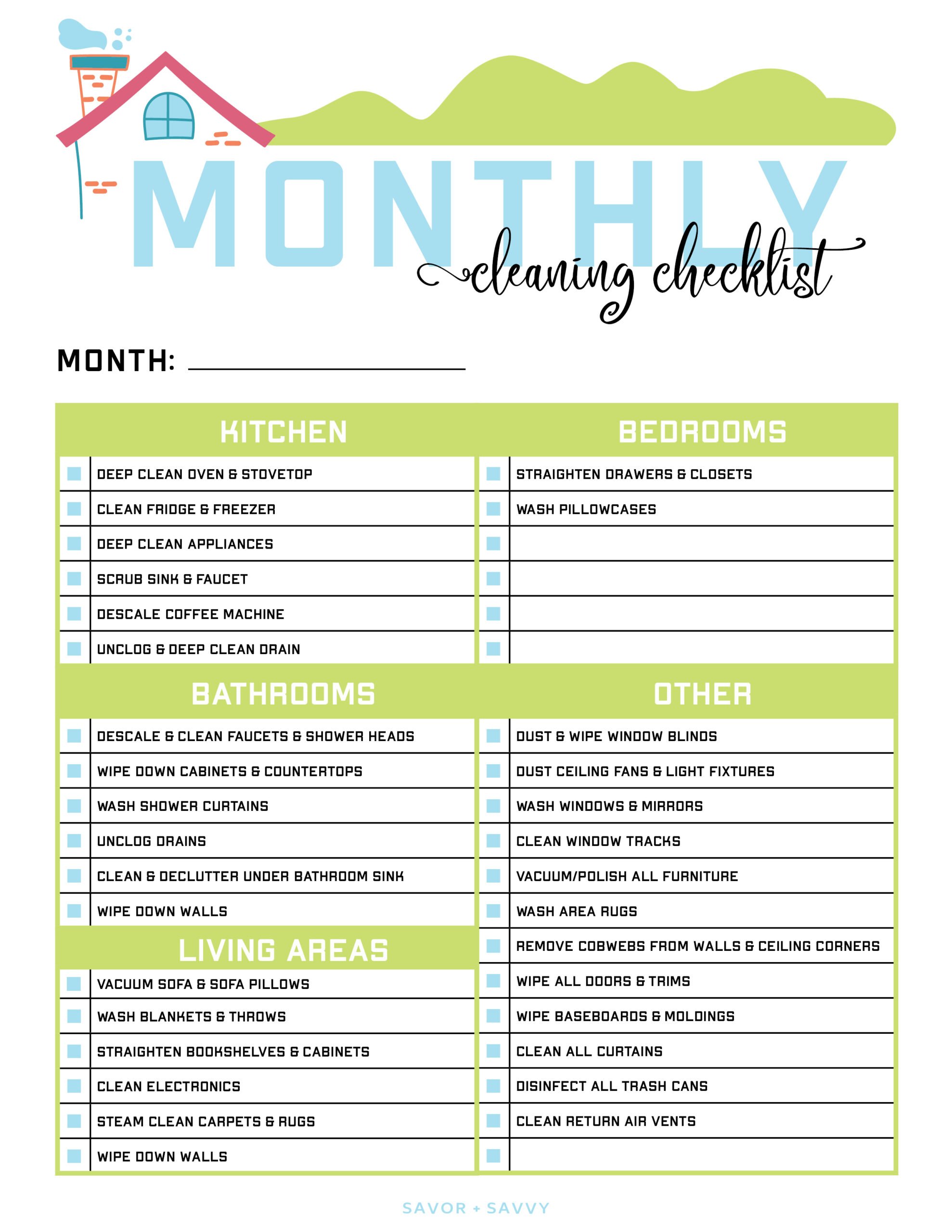 👉Monthly Cleaning – Dig a little deeper for those tougher monthly jobs that will require a little bit more effort. Grab your family and spend Saturday morning completing this checklist.